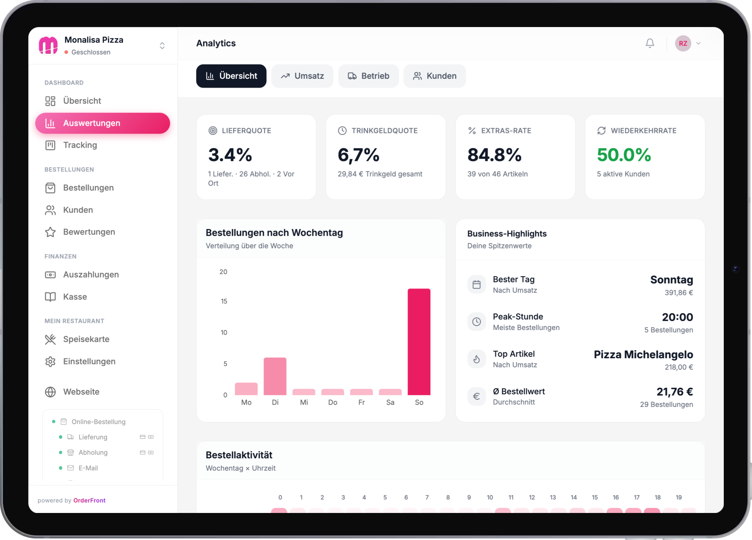 - Eigene Bestellwebseite (slug.orderfront.app)
